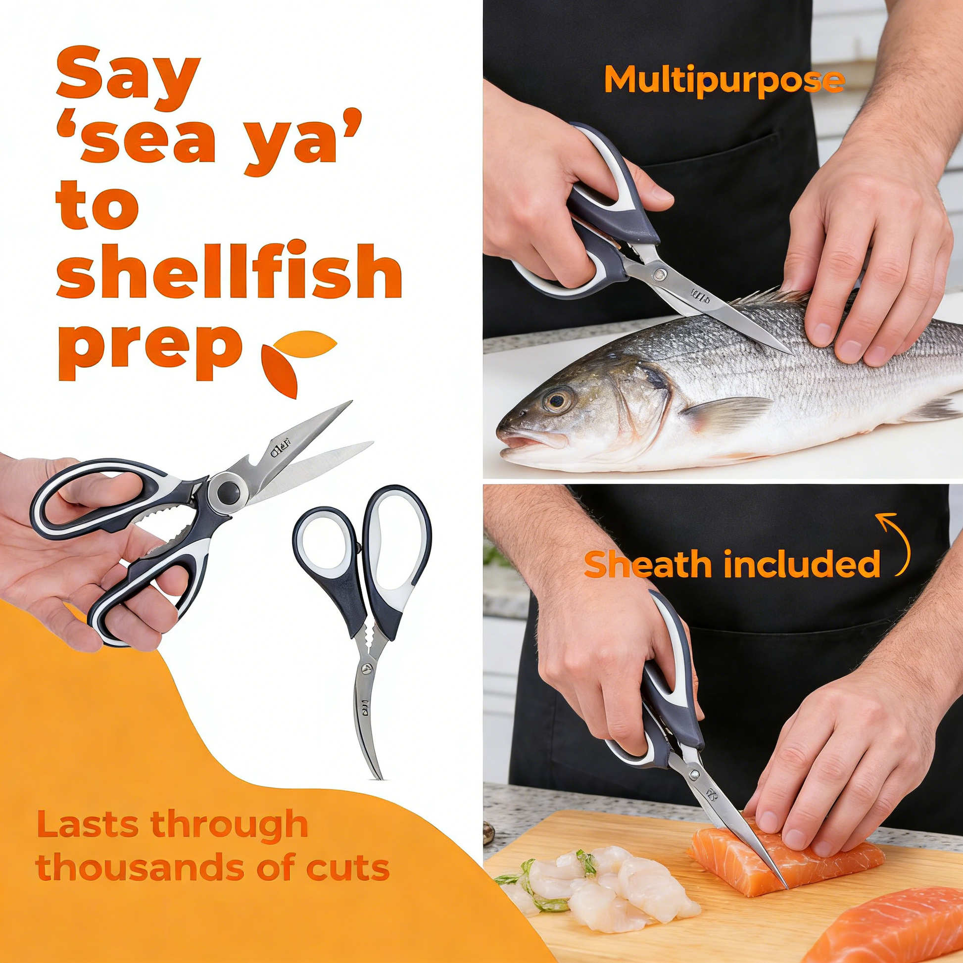 - Multipurpose Use: Cuts meat, seafood, veggies, nuts, and opens bottles/packages